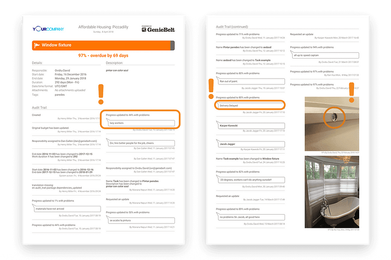 With a system like this, the project team will never have to wonder who did what and can feel assured that photos, videos, comments, progress reports and date changes are all logged into the system. An example of an audit trail: