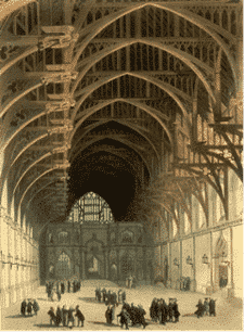 The earliest part of the structure we still have today is the Westminster Hall. This was erected in 1097, at which point it was the largest hall in Europe. The roof was probably originally supported by pillars, giving three aisles, but during the reign of King Richard II, this was replaced by a hammerbeam roof, “the greatest creation of medieval timber architecture”, which allowed the original three aisles to be replaced with a single huge open space, with a dais at the end. The rebuilding had been begun by King Henry III in 1245, but had by Richard’s time been dormant for over a century. The new roof was commissioned in 1393.