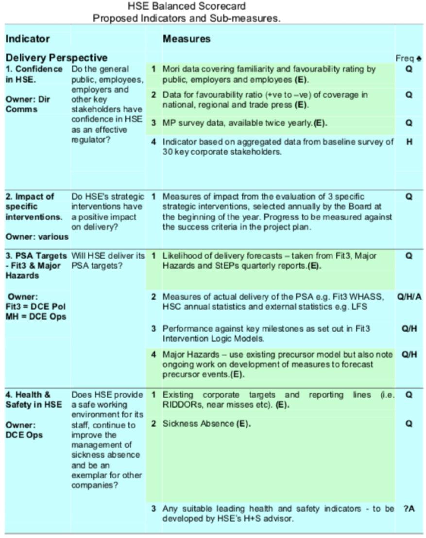 Here is an example of an HSE Balanced Scorecard (Health and Safety Executive, 2005). For the entire document, please follow the link.