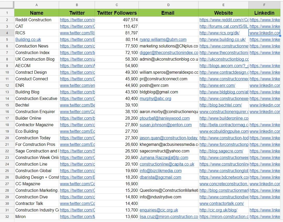Just click on the spreadsheet below and get an overview of the best blogs in construction. You can find contact information and links to their website and social media channels.