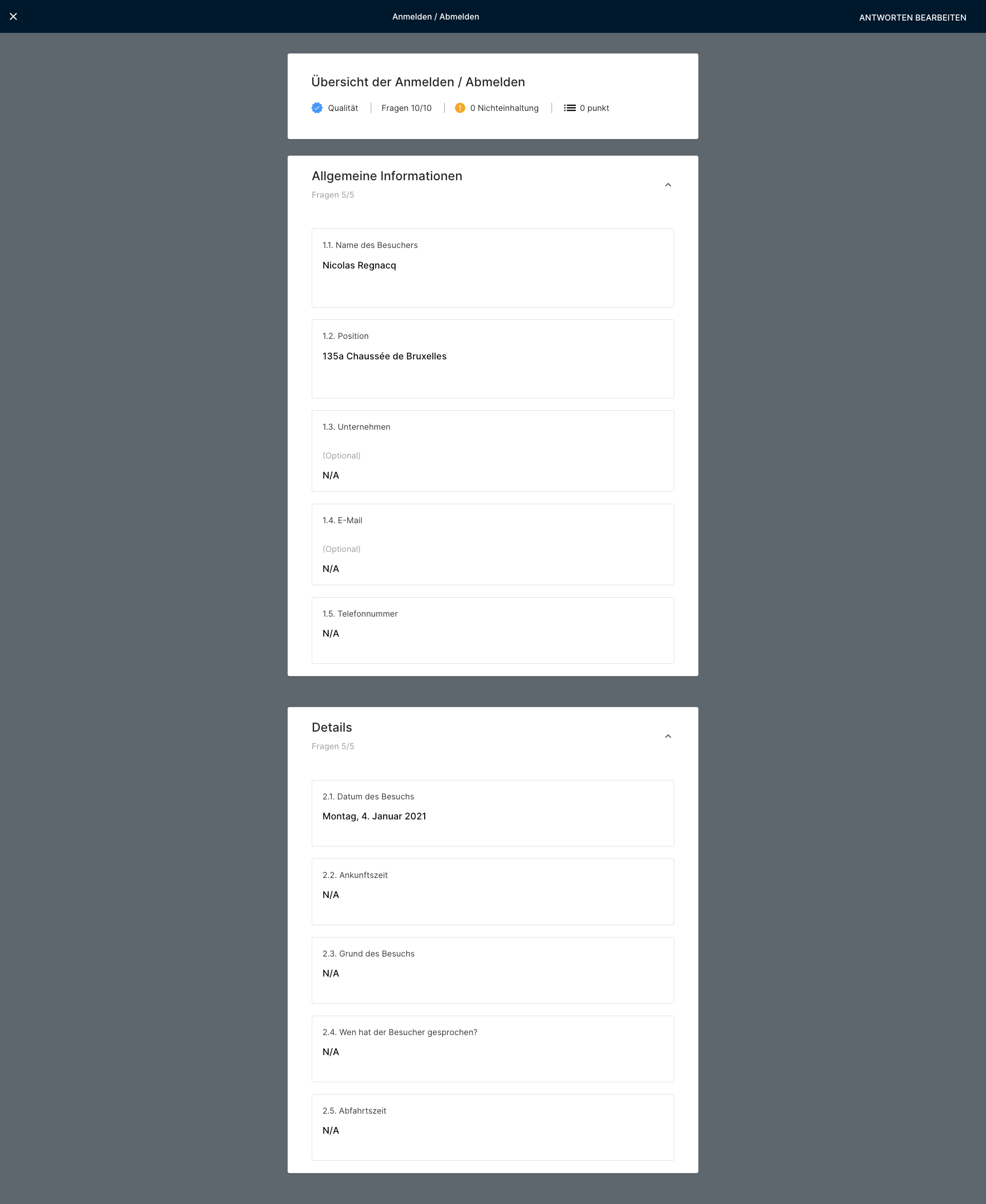 Beispiel: Ein Architekt kommt zu Besuch. Bei seiner Ankunft meldet er sich beim Bauleiter, der das Check-in/Check-out-Formular ausfüllt. Beim Verlassen unterschreibt er das Formular, um seine Abreise zu bestätigen.