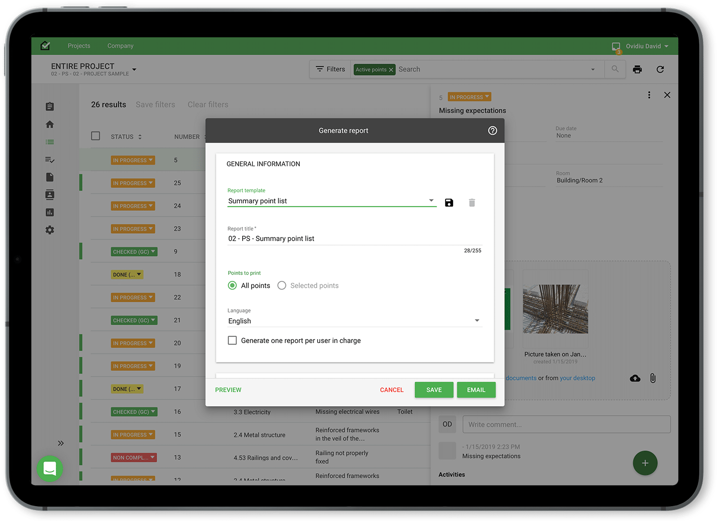 Perform checks and tasks whilst on site using the mobile app and generate error-free reports that can be quickly shared to your teams via the app. You can also export reports as PDF files that can be shared with your project stakeholders who need summaries or printouts.