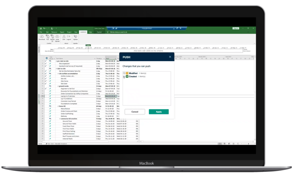 Chez LetsBuild, nous comprenons combien il est important et précieux pour vous de pouvoir intégrer LetsBuild avec vos outils de planification quotidiens existants tels que MS Project afin d’éviter le travail en double et de faciliter l’adoption.
