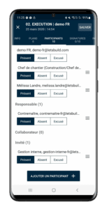 Lorsque vous travaillez sur une tablette, vous êtes déjà en mesure d’accéder aux paramètres de la liste et de modifier les participants, les signatures ou les documents qu’elle contient. D’autre part, de plus en plus de nos utilisateurs utilisent strictement leur téléphone sur site plutôt qu’une tablette. Il est donc tout à fait logique de leur donner les mêmes possibilités sur mobile que sur tablette !