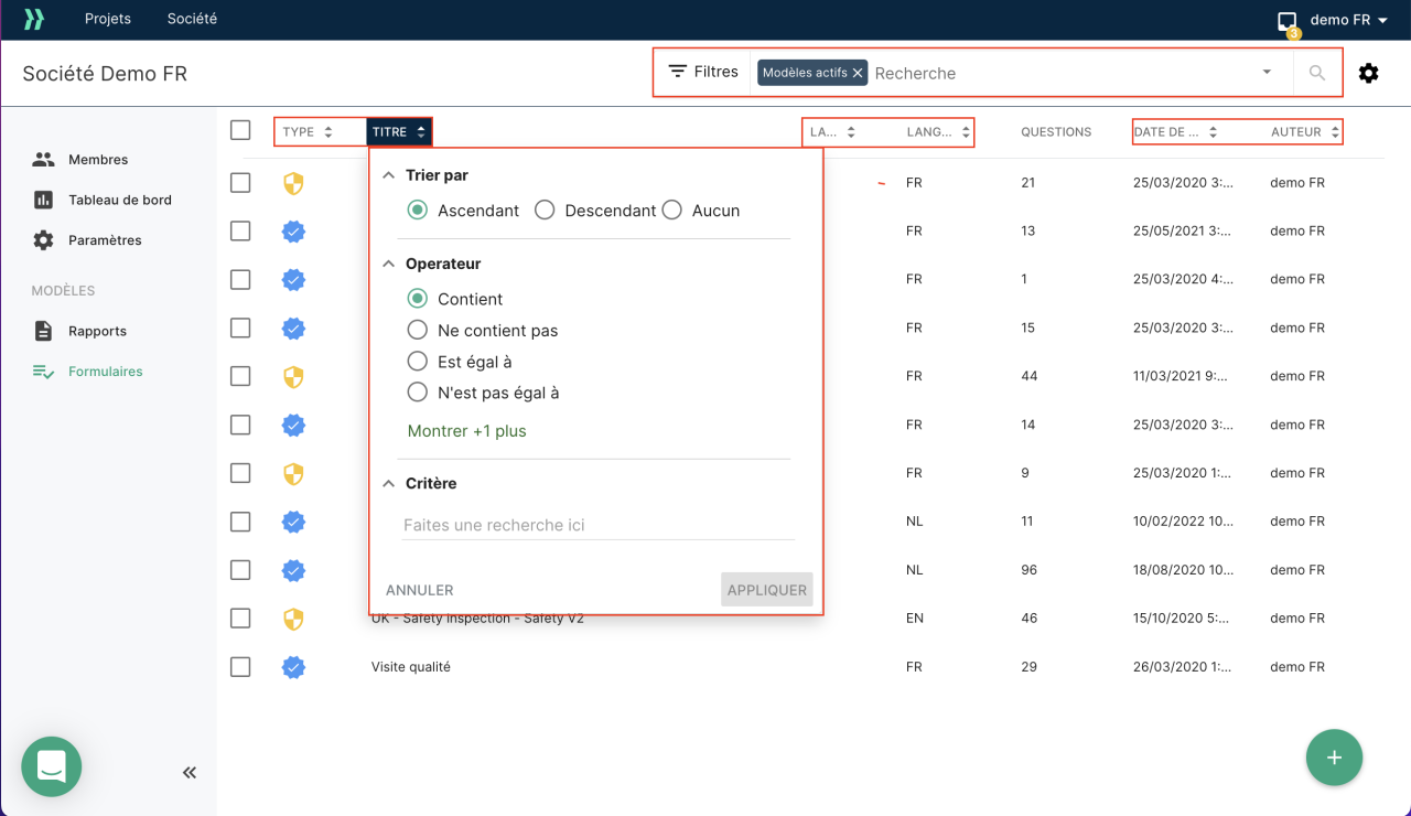 Désormais, vous pouvez trier et filtrer vos modèles de formulaires directement sur la base du Type, du Titre, de la balise, de la langue, de la date de modification ou de l’auteur.