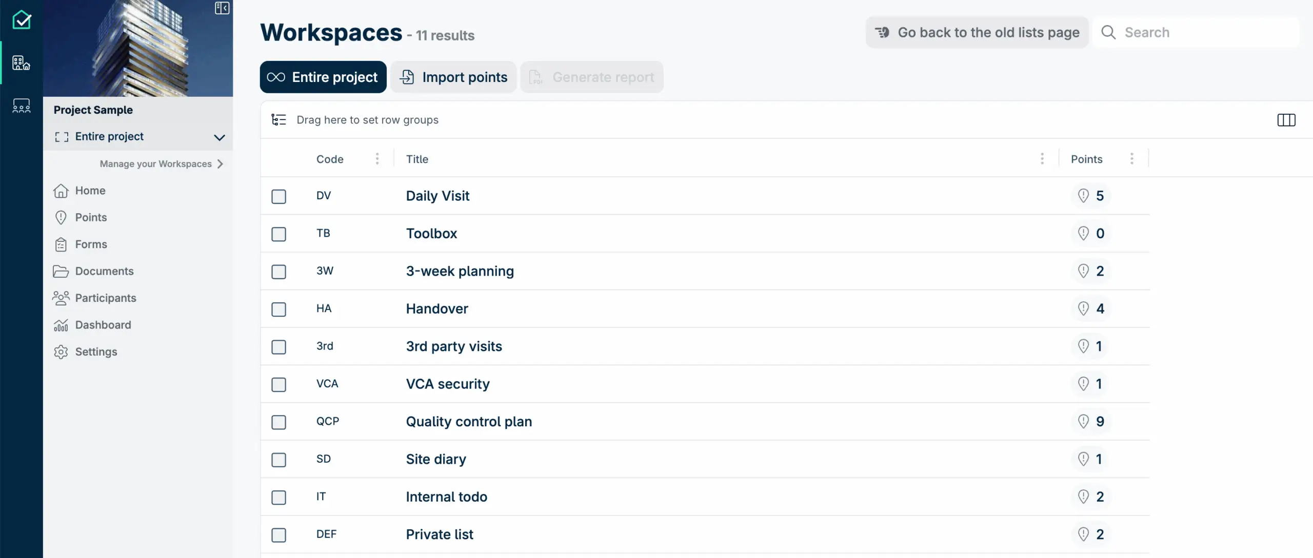 Regroupez tous les aspects de votre projet, plans, dessins, checklists, rapports et listes de remarques dans des Espaces de Travail dédiés. Cela évite aux équipes sur site de chercher dans des dossiers sans fin et leur permet de trouver rapidement ce dont elles ont besoin pour rester sur la bonne voie.