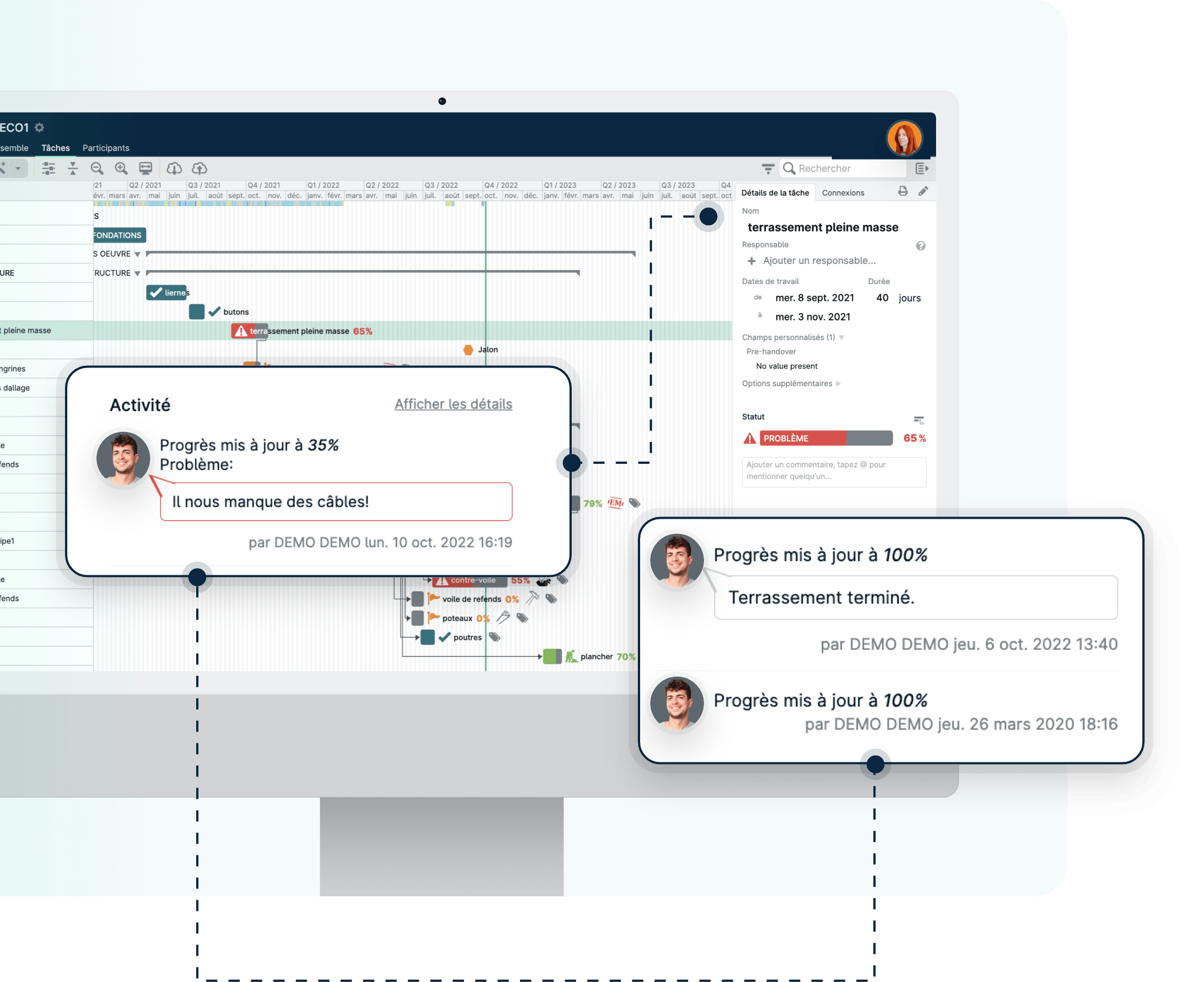 - Améliorez votre réactivité grâce à des conversations textuelles sur un Gantt, en direct et maintenez un échange dans les deux sens.
