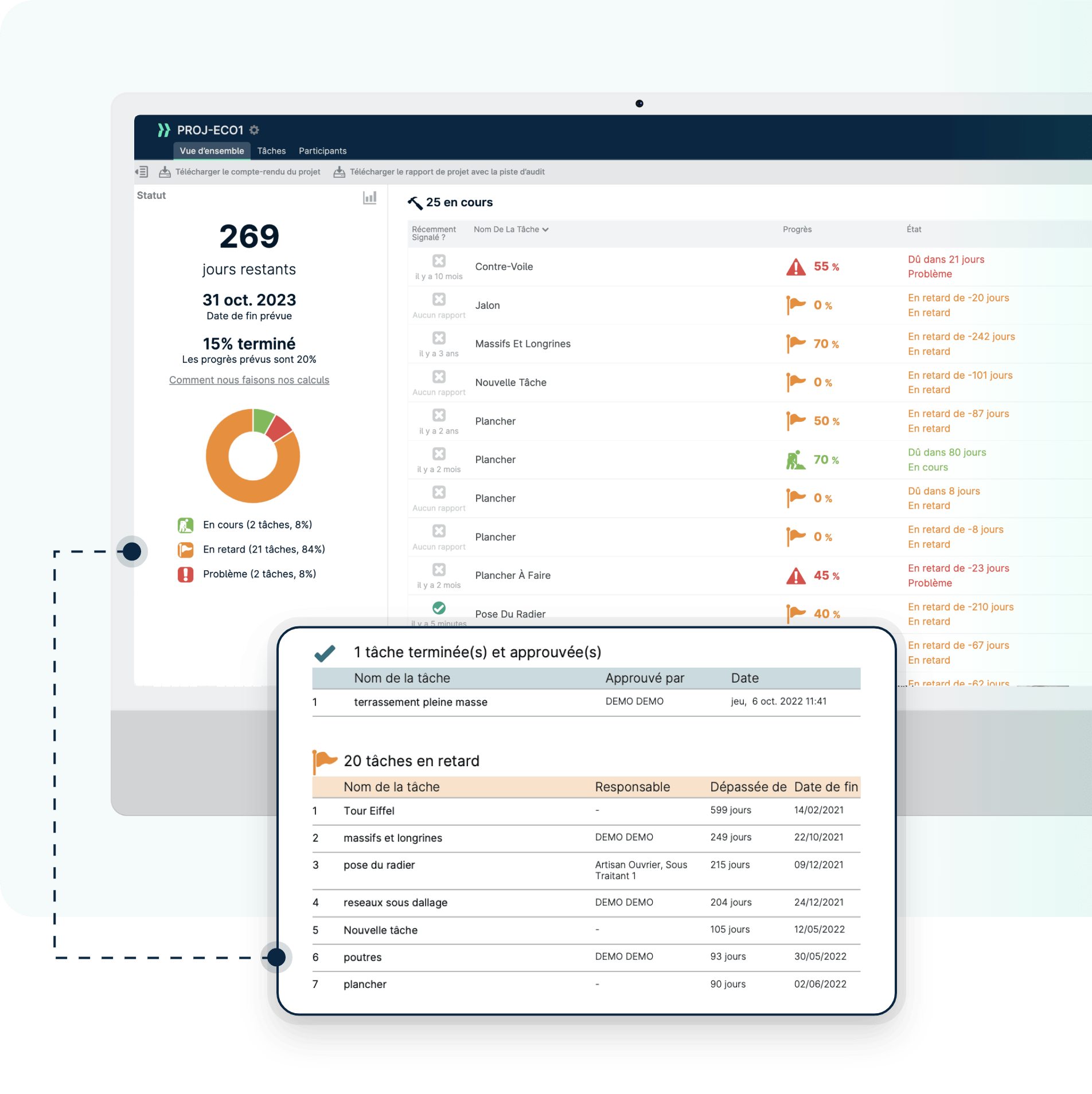 - Faites correspondre le pourcentage d’achèvement dans Primavera P6 en exportant vos données, ou partagez des PDF et obtenez l’approbation rapide et claire de vos partenaires.