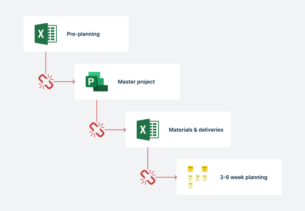 Aujourd’hui, les chefs de projets, les chefs de chantiers, les équipes en charge des achats et des sous-traitants conservent leurs informations dans des outils et formats multiples et déconnectés: Excel, MS Project, Primavera P6, Powerproject, même des tableaux blancs et des notes sur papier. Le plus souvent échangées par e-mail, SMS et WhatsApp.