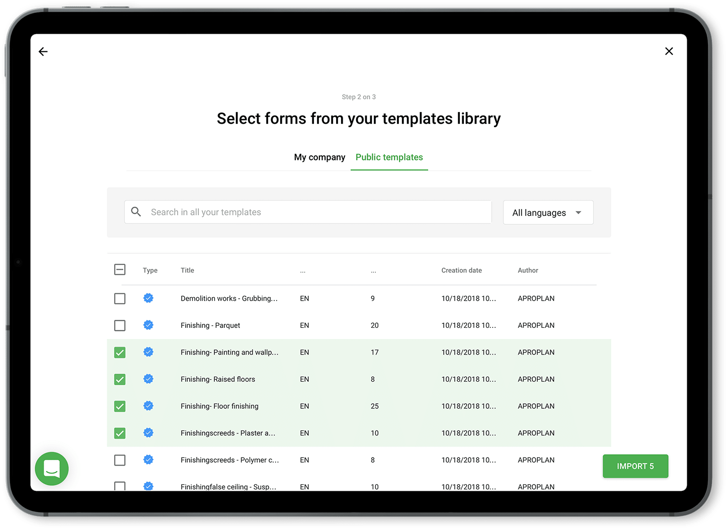 LetsBuild vous permet de créer des modèles en fonction de vos normes internes pour standardiser vos inspections quotidiennes et régulières. Utilisez les mêmes modèles d’un projet à l’autre pour garantir la cohérence au niveau du projet et de l’entreprise.