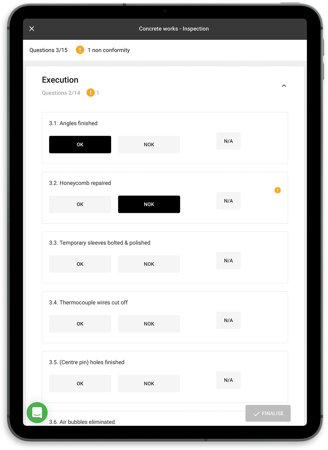 Utilisez des modèles standardisés pour mener des inspections de routine sur le chantier. Enregistrez toute observation directement sur votre appareil mobile pour des audits plus rapides et des créations de rapports simplifiés.