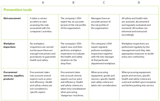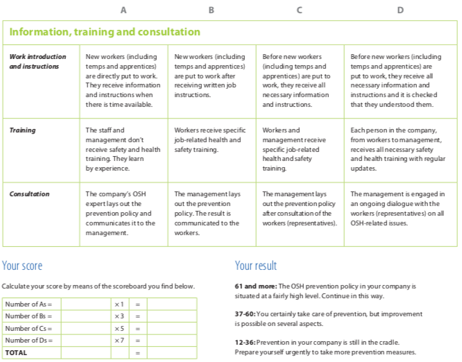 Dit zelfbeoordeling tool (gebaseerd op de OSH leiderschap zelfbeoordeling gids van de EU-OSHA) is een goede start om de stand van preventie van je bedrijf te evalueren. Deze zelfevaluatie gids staat je toe de nodige gegevens te verzamelen en de mogelijkheden tot verbeteren van je situatie beter te begrijpen.