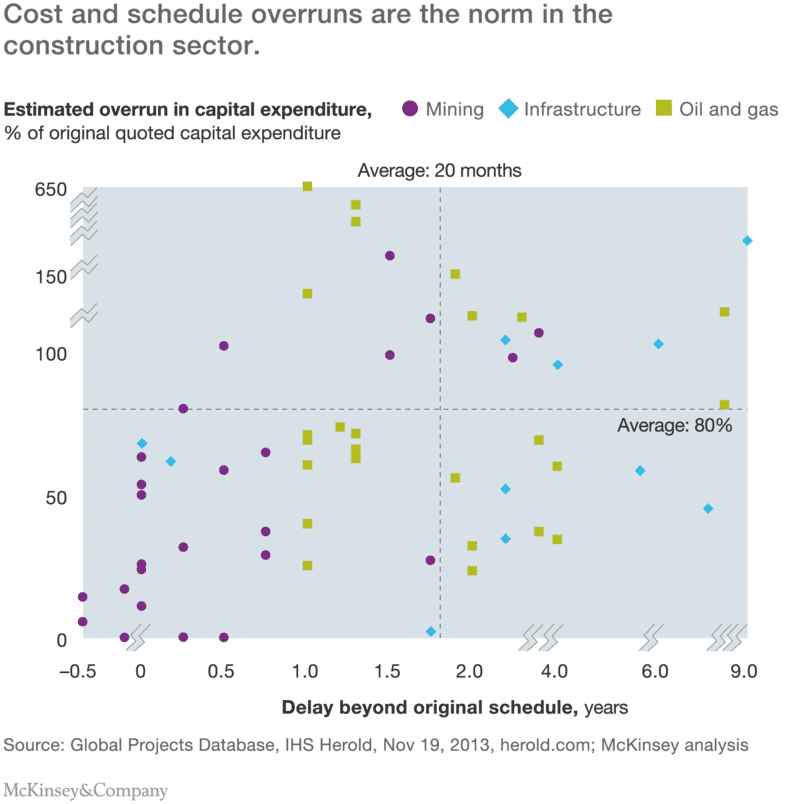 Traditionele bouwpraktijken kunnen kostelijk en ondoeltreffend zijn. In de praktijk slaagt de sector er niet in om grote projecten tijdig af te leveren en met naleving van budget en specificaties. In een apart onderzoek werd gerapporteerd dat 98% van deze projecten de kostenramingen met meer dan 30% overschreden, terwijl 77% minstens 40% te laat waren (McKinsey, 2015).