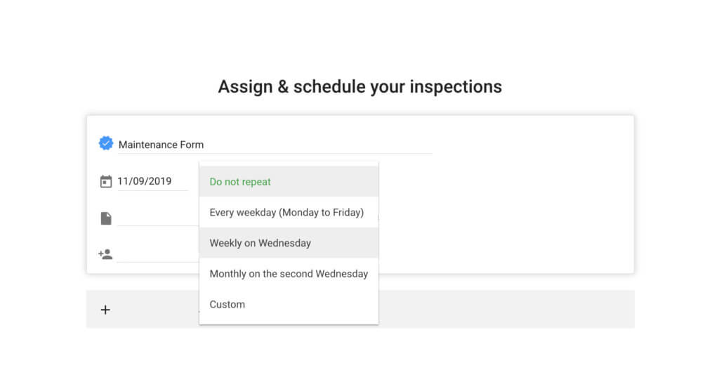 Creëer meerdere voorvallen van hetzelfde Formulier in plaats van dat u ze stuk per stuk moet dupliceren. Configureer het aantal voorvallen van uw Formulier, welke dat het zal verschijnen, of zelfs als het voorval eindigt na X aantal voorvallen of een specifieke datum. U kan zelfs plannen hoeveel Formulieren u zal nodig hebben voor de hele projectlooptijd. Een eenvoudig voorbeeld zou zijn de wekelijke brandblusser check door de veiligheidsmanager– hij kan eenvoudig een Formulier aanmaken, deze dupliceren en de benodigde voorvallen van dit Formulier inplannen op een wekelijkse basis.