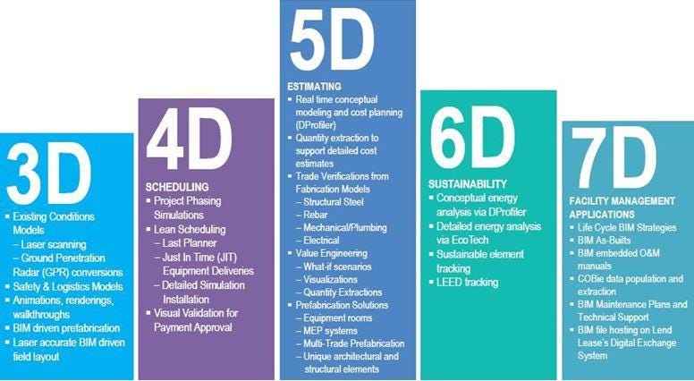 De diverse BIM-subsets worden beschreven in termen van dimensies — 3D (objectmodel), 4D (tijd), 5D (kosten), 6D (operationaliteit), 7D (duurzaamheid) en zelfs 8D (veiligheid) (Smith, 2014).