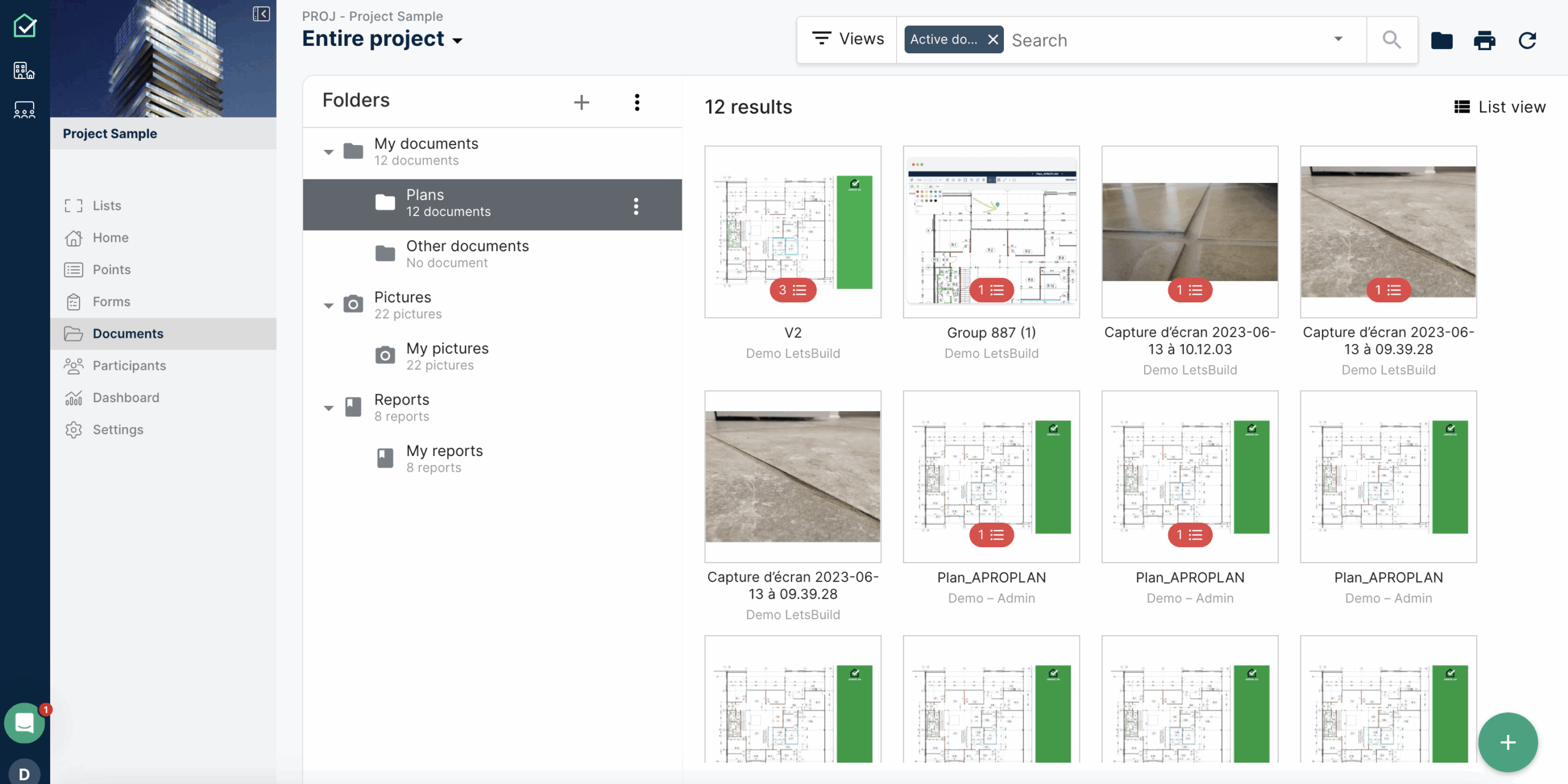 Sla tekeningen, rapporten, foto’s en plannen op in een centrale locatie. Organiseer ze in mappen, bekijk ze als lijsten of miniaturen, en houd alles gestructureerd voor het hele team.