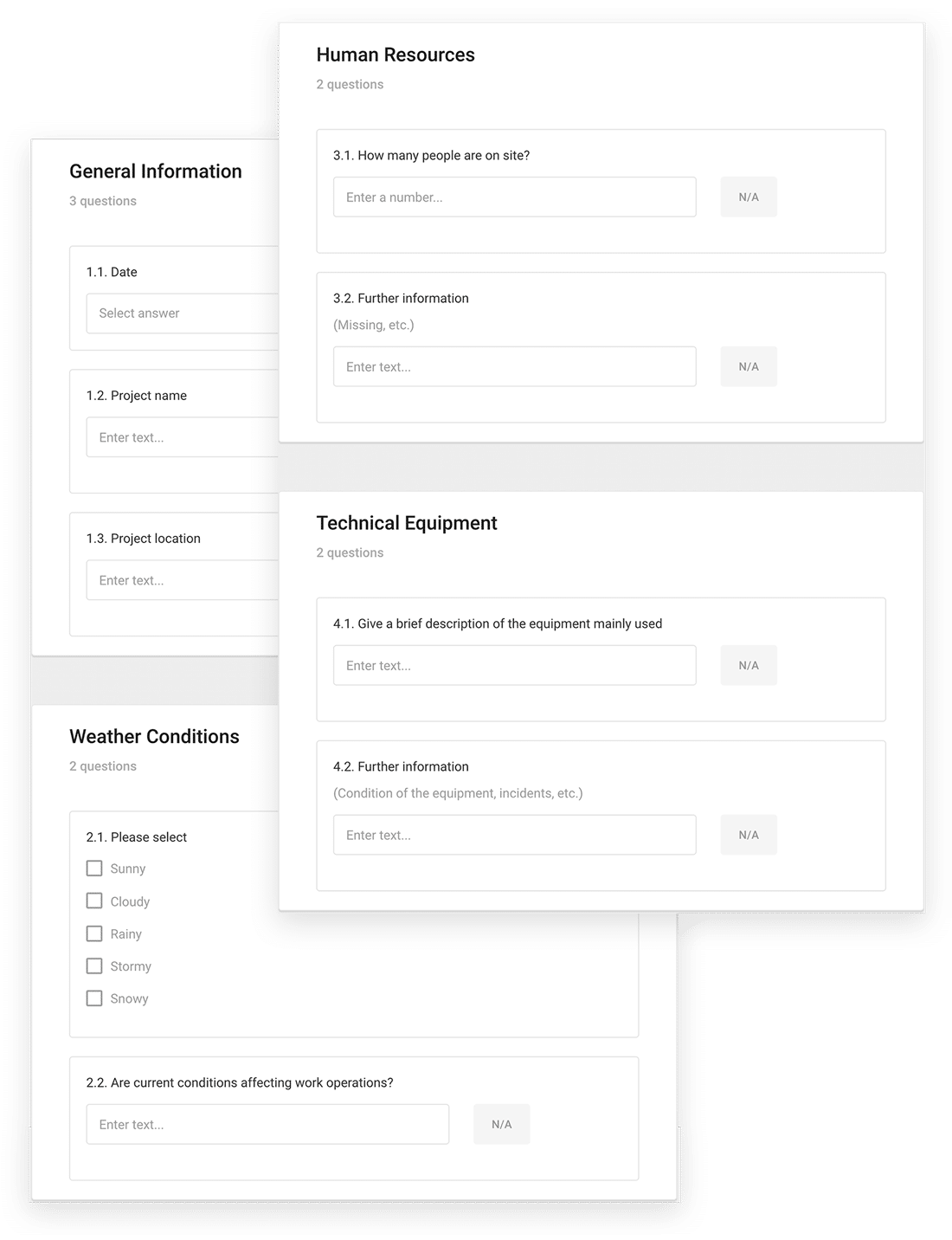 Configureer welke data u wilt verzamelen op een dagelijkse basis. Van materialen inventaris en leveringen tot werktuigstatus, LetsBuild geeft u de mogelijkheid om alle activiteiten en data te noteren die u nodig heeft om uw projecten te managen.
