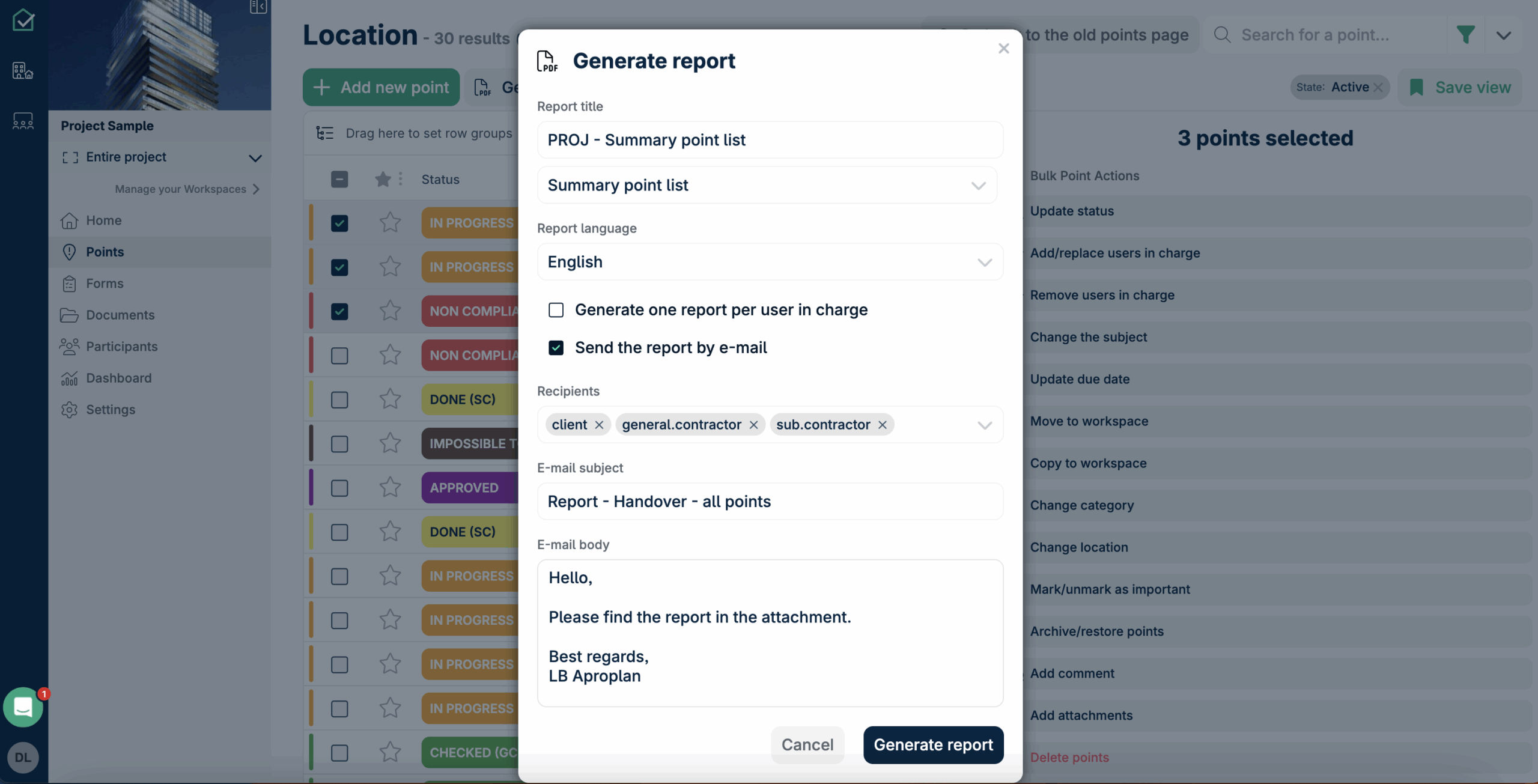 Regularly, a point is made with the QSE auditor, and we extract the forms and non-conformities, and we make an impression at the instant T of the platform to ensure a follow-up of the points. Aproplan, is a living app.