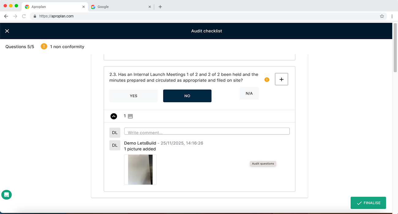 Discover how Aproplan can help you standardise quality checks, speed up issue resolution, and keep every team aligned on-site and in the office. Book a personalised demo and see how effortless inspections can be when everything is centralised in one platform.